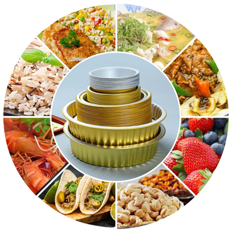 Drop shipping oven safe tin food packaging tray set folding edge round bowl 1370ml deep gold round foil pans with cover |