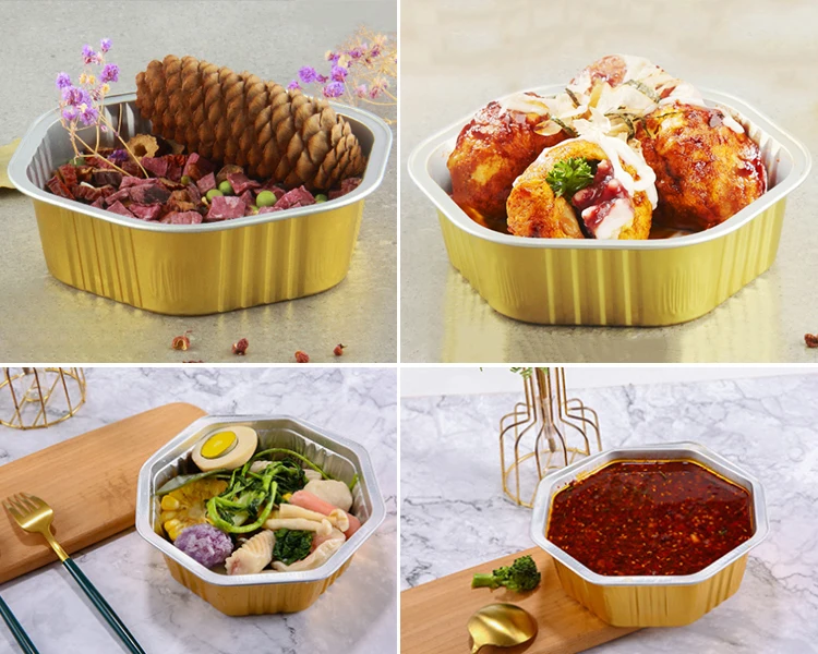 OEM & ODM hexagon thickened seafood dessert cupcake food packaging golden 400ML disposable aluminum foil containers with lid |